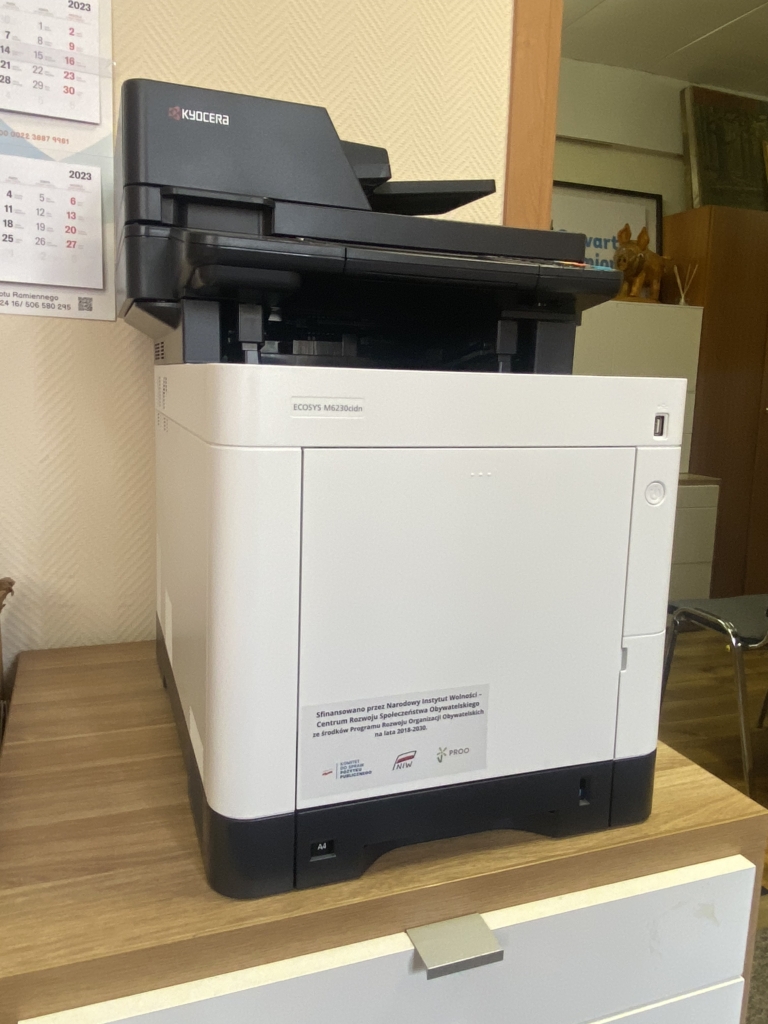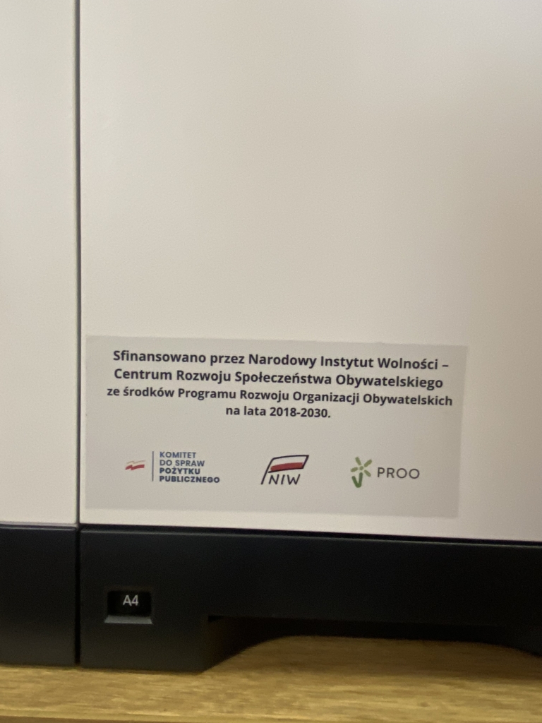 Sprzęt został zakupiony w ramach Programu Rozwoju Organizacji Obywatelskich na lata 2018–2030 PROO Priorytet 5 Pomoc Doraźna Edycja 2023. Rozpoczęcie 29.05.2023 –  zakończenie 17.07.2023