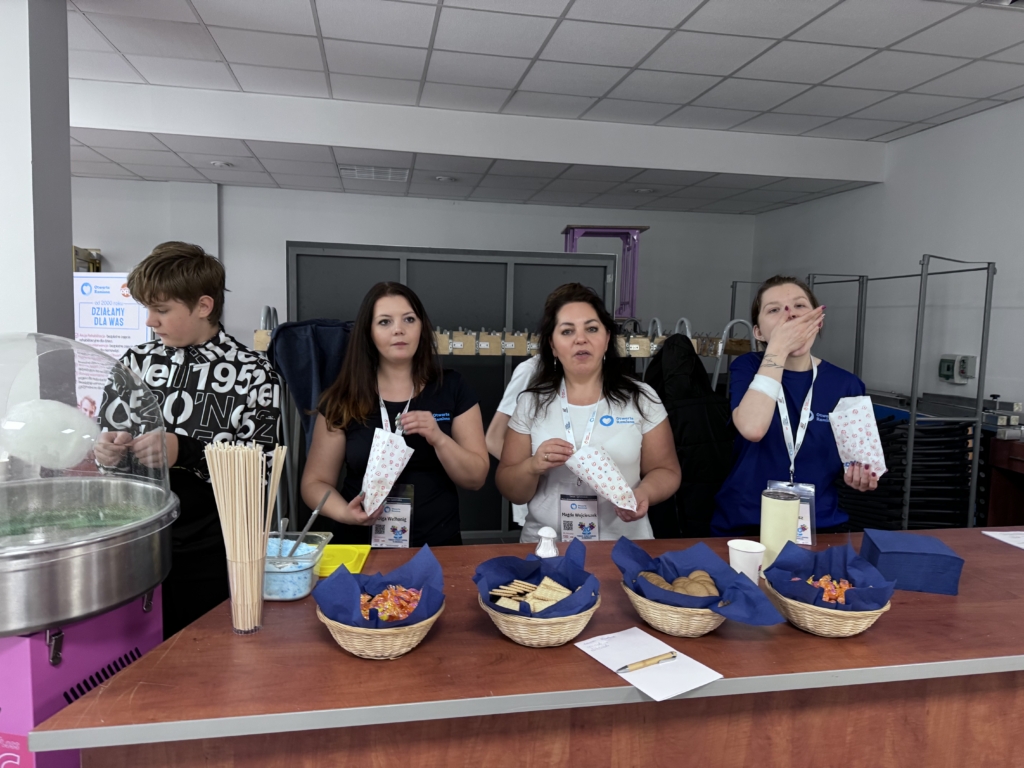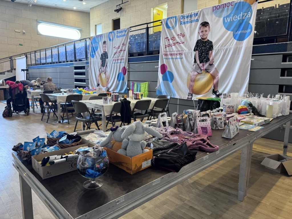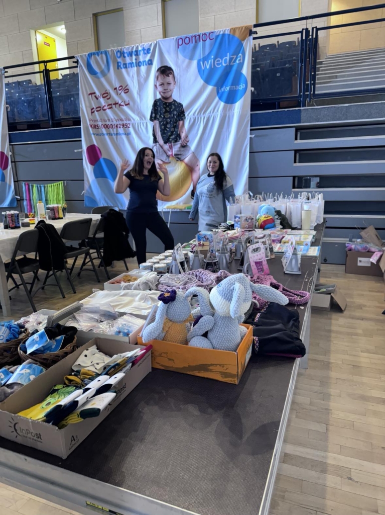 Dla wszystkich smakoszy mamy darmowy popcorn i watę cukrową. Trwają warsztaty fotograficzne, które prowadzi Tomasz Kordek. Przyjechał nasz sklepik, kory na codzień można odwiedzać online pod adresem www.sklep.otwarteramiona.pl. Każdy chętny może wziąć udział w warsztatach wielkanocnych. Jest też kącik zabaw dla dzieci. Całą imprezę wspierają nasi wolontariusze, którymi opiekuje się Magdalena Wojcieszek, nasza koordynatorka wolontariatu.