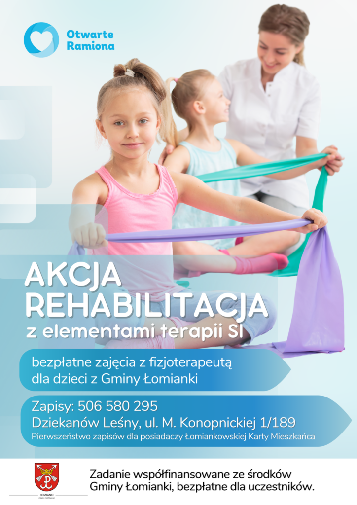 Otwarte Ramiona dzięki wsparciu Gminy Łomianki, pomaga już 11 lata dzieciom z naszego terenu. Właśnie trwa nabór do kolejnej edycji na zajęcia rehabilitacyjne pod nazwą „Akcja Rehabilitacja”. Zapraszamy rodziców i opiekunów dzieci aby zapisywali swoje pociech na zajęcie z certyfikowaną kadrą terapeutyczną. Pierwszeństwo w zapisach będą mieli posiadacze Łomiankowskiej Karty Mieszkańca.