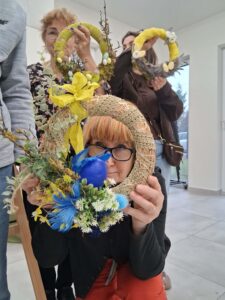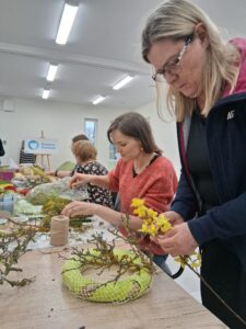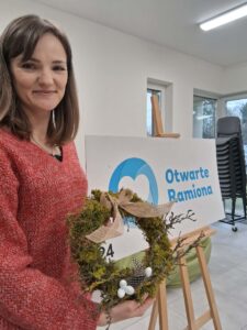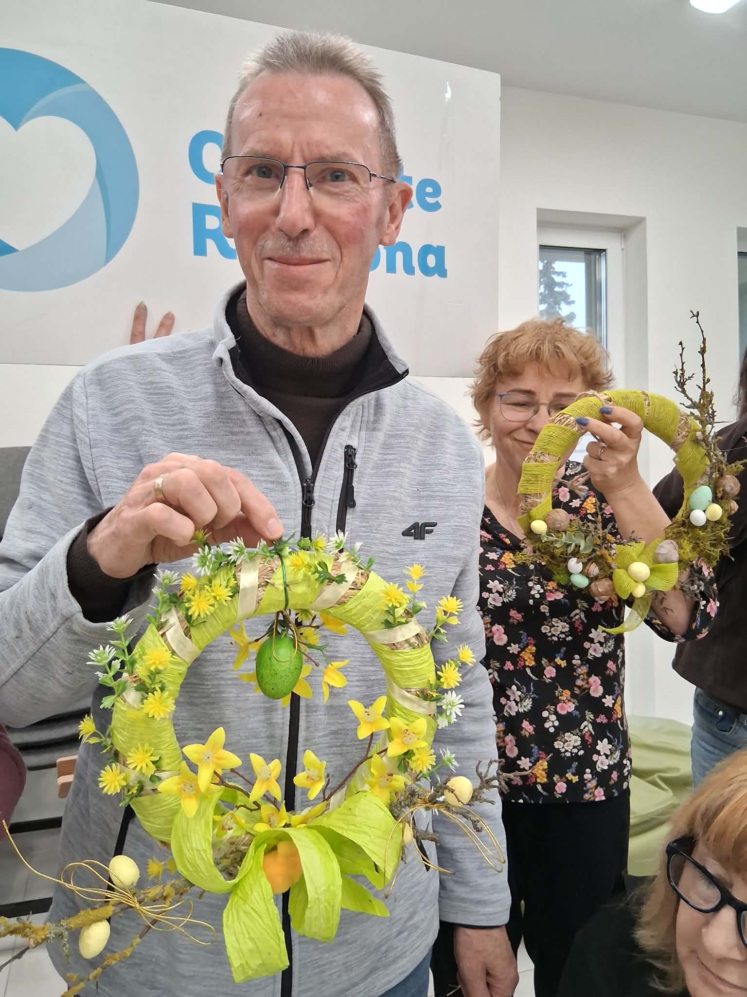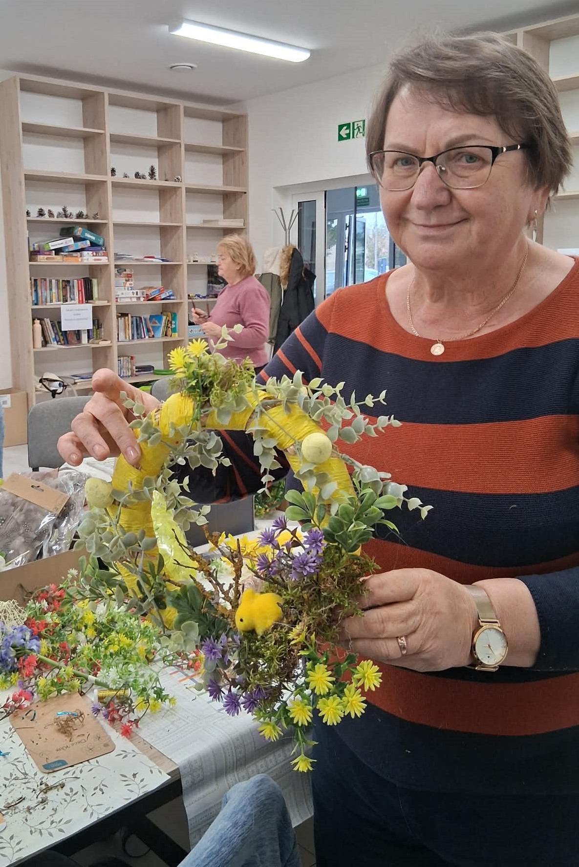 W przytulnej, już świątecznie udekorowanej sali uczestnicy pracowali nad kompozycjami w klasycznej, wielkanocnej kolorystyce. Żółcie, błękity i zielenie dominowały w materiałach, a po sali fruwały kolorowe piórka i wstążki. Każdy wianek został dodatkowo ozdobiony pisankami, co podkreśliło sezonowy charakter zajęć.