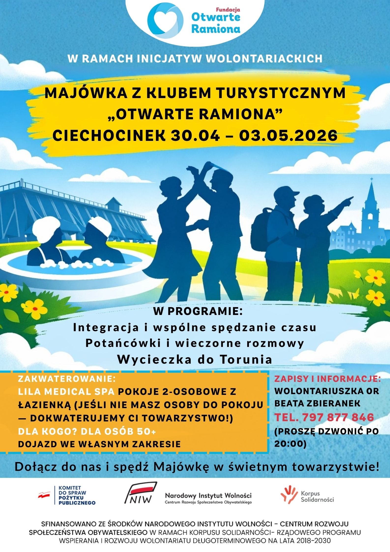 Fundacja Otwarte Ramiona zaprasza osoby 50+ na wyjątkowy wyjazd majówkowy organizowany przez Klub Turystyczny Otwarte Ramiona. To doskonała okazja, aby spędzić kilka dni w pięknym Ciechocinku, zrelaksować się, poznać nowych ludzi i aktywnie wejść w wiosenny czas.