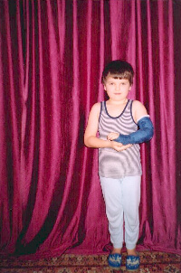 Mój syn Tomasz ma obecnie 4,5 roku. Jest dzieckiem nadpobudliwym i bardzo do mnie przywiązanym . Ma duże kłopoty z mową i często denerwuje się kiedy, ze względu na kaleką rękę, nie może czegoś wykonać. Do 2 roku życia był ćwiczony metodą Vojty. Dopiero od roku wiemy i korzystamy z turnusów rehabilitacyjnych w Szpitalu Dziecięcym w Dziekanowie Leśnym, specjalizującym się w rehabilitacji uszkodzeń splotu ramiennego. Niestety ręka dziecka jest nadal słaba a dłoń ma przykurcze. Tomek potrafi podnieść rękę trochę do góry, ale dłoń jest w dalszym ciągu bezwładna i opadająca. Aby opiekować się synem musiałam zrezygnować z pracy, przyznano mi wcześniejszą emeryturę. Jednak finanse, którymi dysponuję są niewystarczające na pokrycie kosztów leczenia mojego syna. Nigdy nie będzie mnie stać, aby wykorzystać każdą szansę pomocy Tomaszkowi. Mam jeszcze trzy córki, o których nie mogę zapominać. Moim największym marzeniem jest, aby mój syn został zoperowany. Wiem, że operacja spowodowałaby poprawę jego ręki, ale czasem myślę, że dążenie do tego przerasta moje siły.