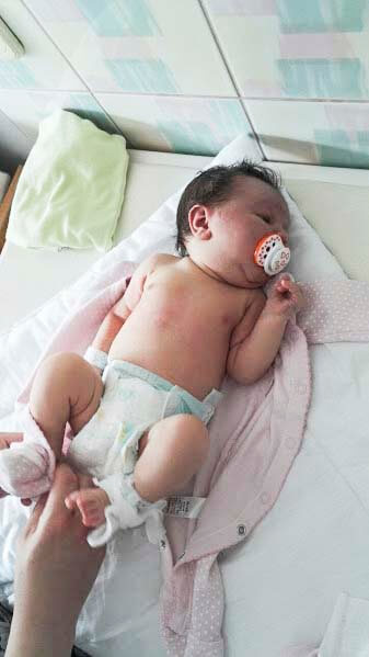 Laura ważyła 3990 g i mierzyła 53 cm. Od razu ją zabrano do pokoju noworodka, gdzie przez 2 godziny dochodziła do siebie. Poinformowano nas, że nasza córka ma porażenie splotu barkowego prawej ręki typu Erba i takie sytuacje się zdarzają. Wszystkie funkcje ręki powinny wrócić samoistnie w ciągu 3-4 miesięcy. Ponadto doszło do wylewu do nadnerczy, który powoli się wchłaniał, a sińce z dnia na dz