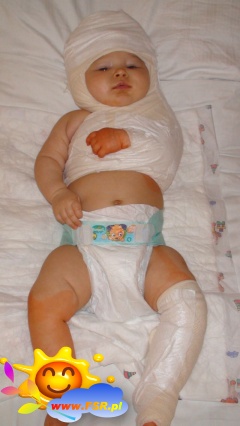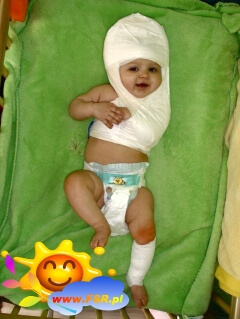 Od trzeciego tygodnia życia Dominika jest rehabilitowana codziennie 4 razy dziennie, 2 lub 3 razy w tygodniu jeździmy do specjalisty na rehabilitację. Pomimo codziennych długich ćwiczeń, masowania i naświetlania rączka nie odzyskała sprawności do 3 miesiąca życia (na co bardzo liczyliśmy). Po trzech miesiącach ciągłej rehabilitacji zdecydowaliśmy się na wykonanie badania EMG w Centrum Zdrowia Dziecka w Warszawie. Po badaniu okazało się, że splot ramienny jest na tyle uszkodzony, że prawdopodobnie będzie wymagał operacji.
