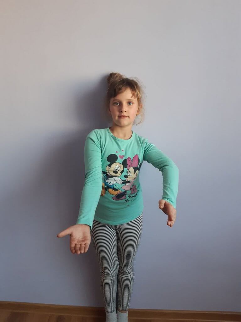 Po urazie okołoporodowym pozostała Jej rotacja ręki do wewnątrz i przykurcze w łokciu, łopatka staje się asymetryczna a ręka krótsza od zdrowej.