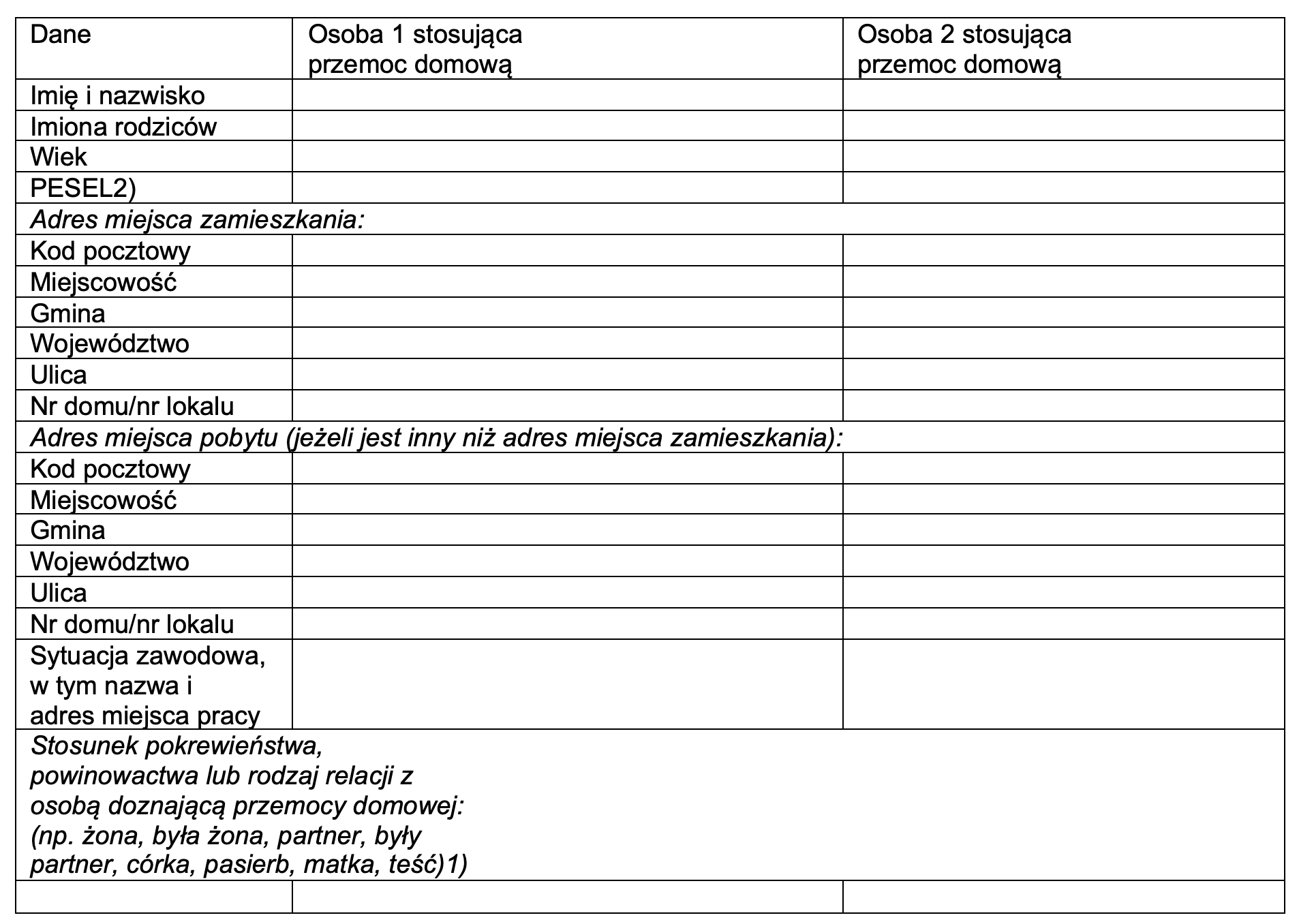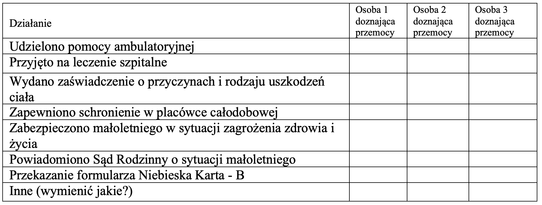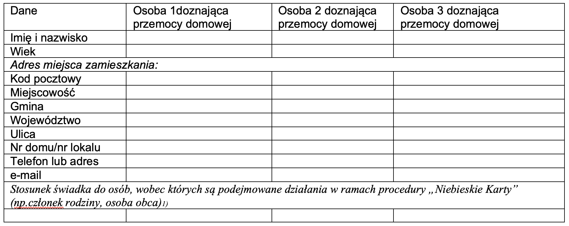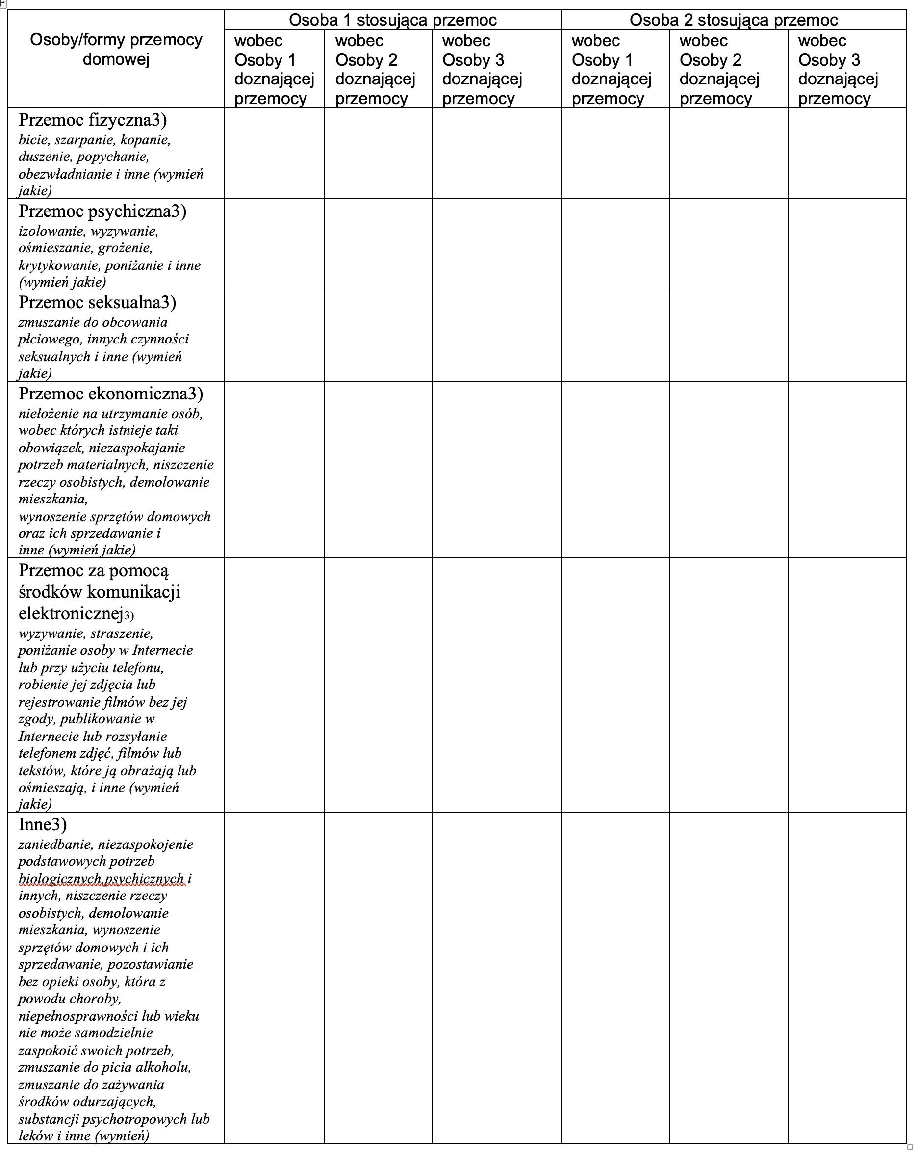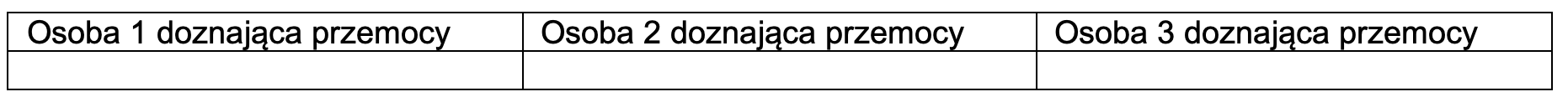 Uwaga! W przypadku większej niż 3 liczby osób doznających przemocy dołącz kolejną kartę zawierająca Tabelę I