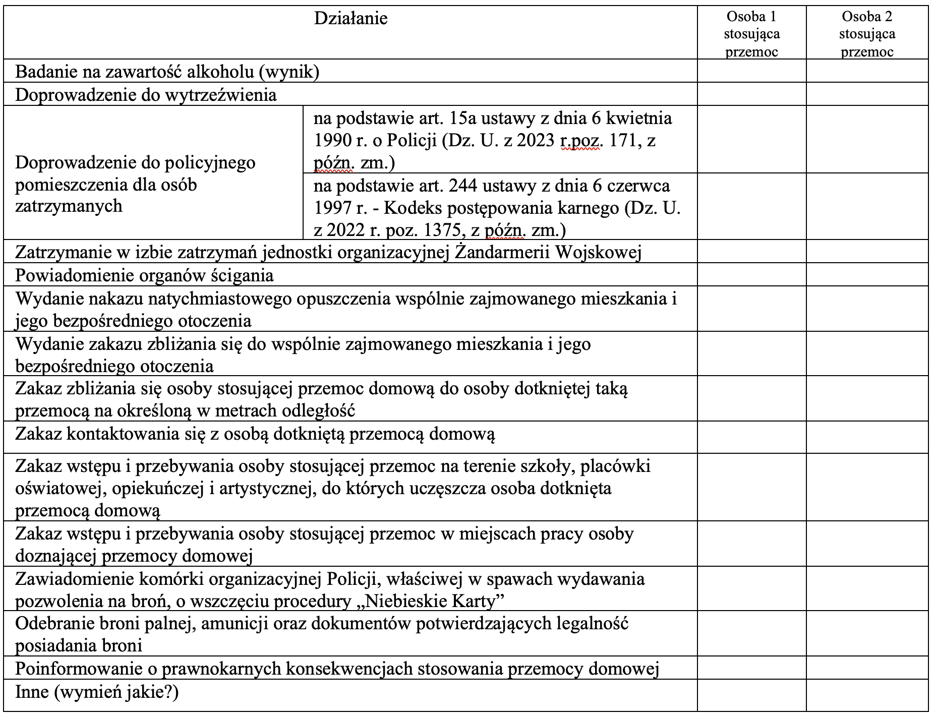 11. DZIAŁANIA INTERWENCYJNE PODJĘTE WOBEC OSOBY STOSUJĄCEJ PRZEMOC DOMOWĄ (zaznacz w odpowiednim miejscu znak X):